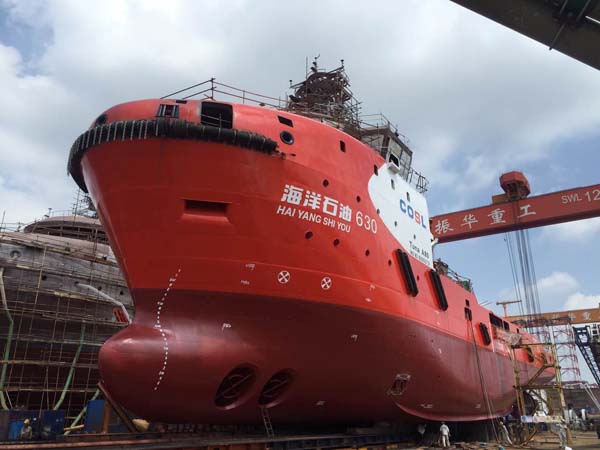 上海振華重工6500HP-1#油田守護(hù)船順利下水