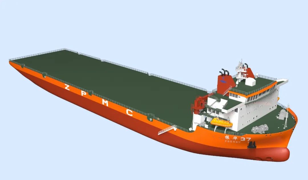 該項(xiàng)目總長(zhǎng)170米,型寬40米,型深10.5米,箱形船體,直角船尾,舭部斜角、縱骨架式、單連續(xù)甲板鋼質(zhì)焊接結(jié)構(gòu),艉部采用2套吊艙拉式推進(jìn)器作為主推進(jìn)裝置,服務(wù)航速下續(xù)航力大于18000海里,具備艉部與兩舷側(cè)滾裝滾卸功能,滿足無限航區(qū)調(diào)遣作業(yè)要求,具有甲板面積大、作業(yè)水深大、抗風(fēng)等級(jí)強(qiáng)等優(yōu)點(diǎn),是振華重工自建的第一艘3萬噸級(jí)甲板船。